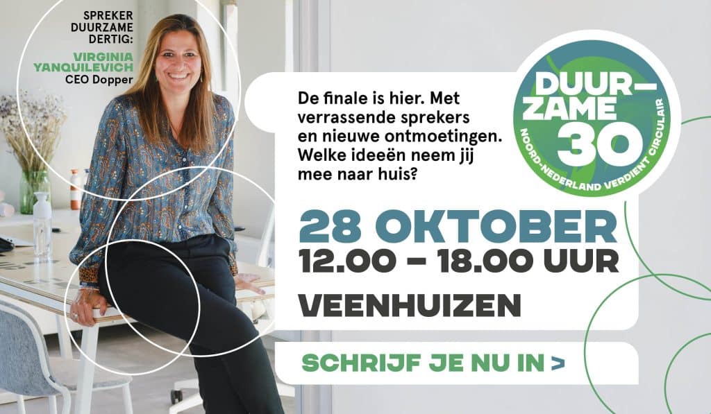 Wil je weten welke initiatieven er vandoor gaan met de prijs? Kom op 28 oktober naar de uitreiking van de Duurzame Dertig. Op het podium staan vernieuwers en doeners zoals Virginia Yanquilevich (CEO Dopper) en John Vernooij. Een middag vol duurzame inspiratie met ondernemersverhalen, deelsessies en ontmoetingen!